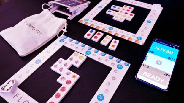 Floristry is an app-assisted two-player auction game where you bid for flower tiles to build a better floral display than your opponent.