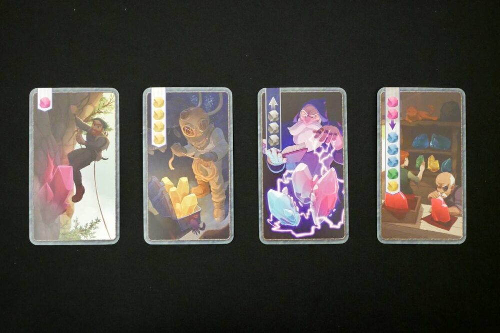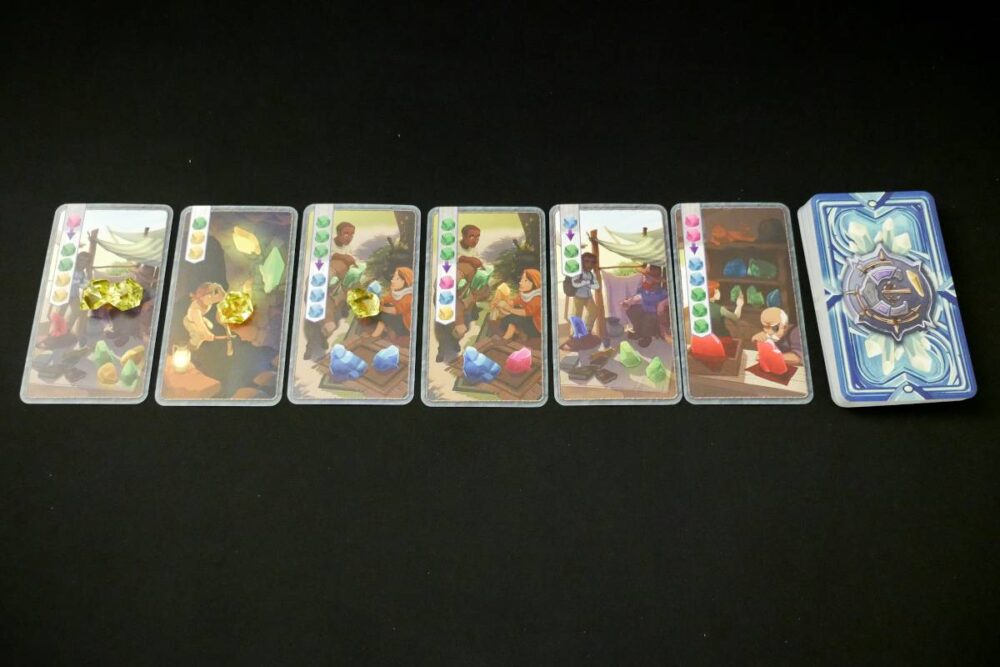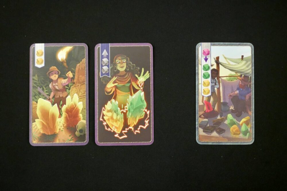 In the center of the table is a 6-card Merchant market. Merchant cards are action cards. Players will be acquiring cards from the market and adding to their hands, providing new ways to gain and manipulate crystals.