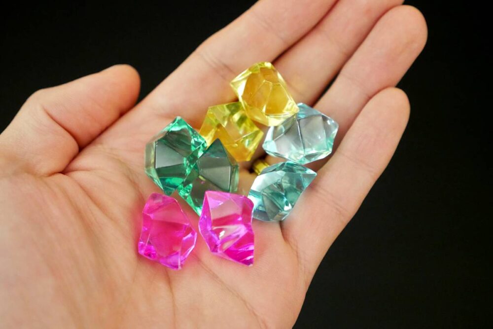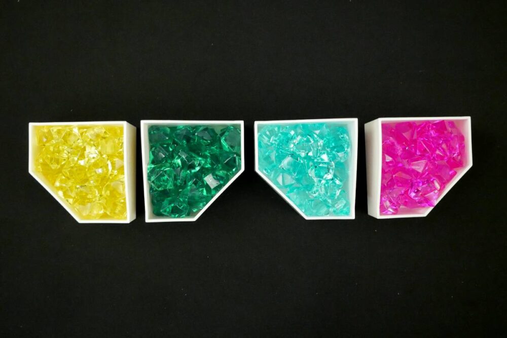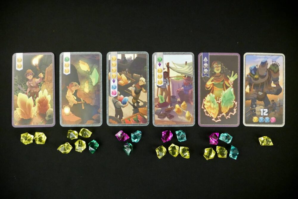 At the core of Century: Golem Edition are crystals, which come in four values from lowest to highest: Yellow < Green < Blue < Pink. These crystals can be converted from one kind to another via action cards, and then spent to buy Golems once you have the right crystals.