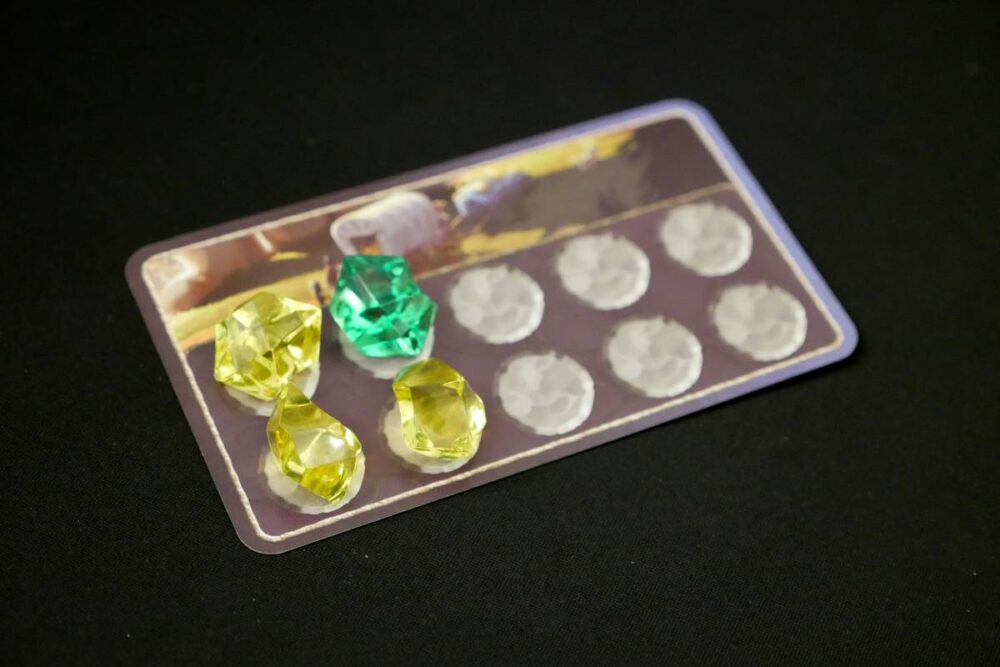 The crystals are pretty, tactile, and fun to handle. Like most of the rest of the production, these are perfectly sized: big enough to carry significance and be easy to pick up and handle, but not so big as to be distracting or wasteful. I like the irregular shape, which injects the game with much-needed tactility, and the colors are gorgeous. Century: Golem Edition would feel much flatter if these were cardboard tokens or wooden cubes; instead, these crystals glimmer with personality.