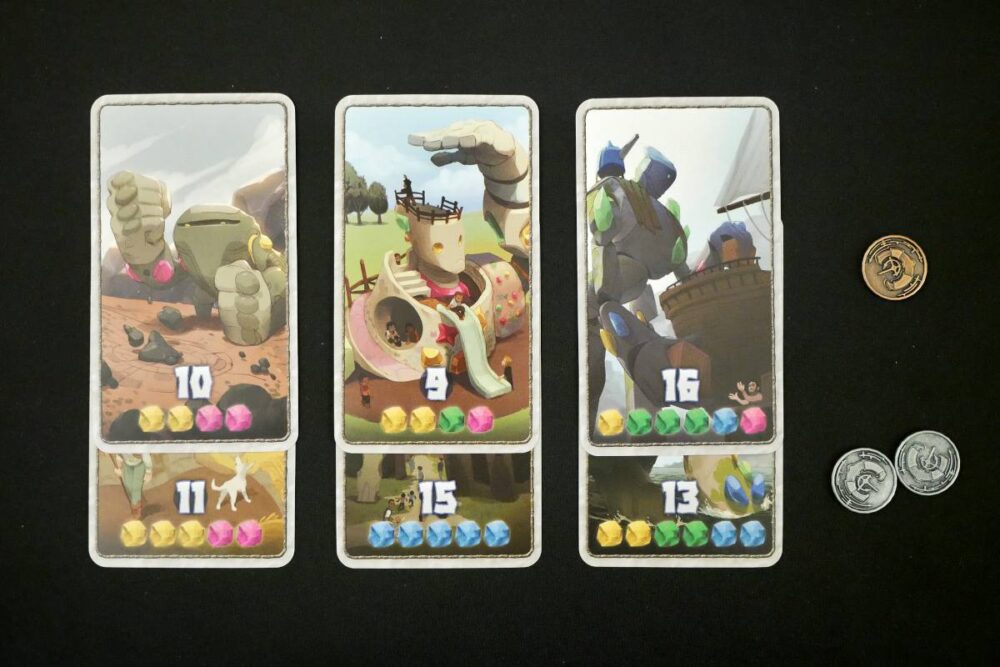 When buying the left-most Golem, you'll also get a Copper Coin with it (worth 3 points at the end). When buying the second-left-most Golem, you'll get a Silver Coin with it (worth 1 point at the end). These coins make "unwanted" Golems more enticing as they slide down the market—but when they run out, they're gone.