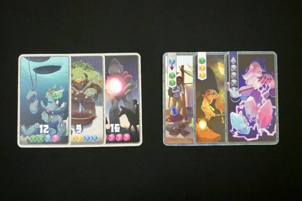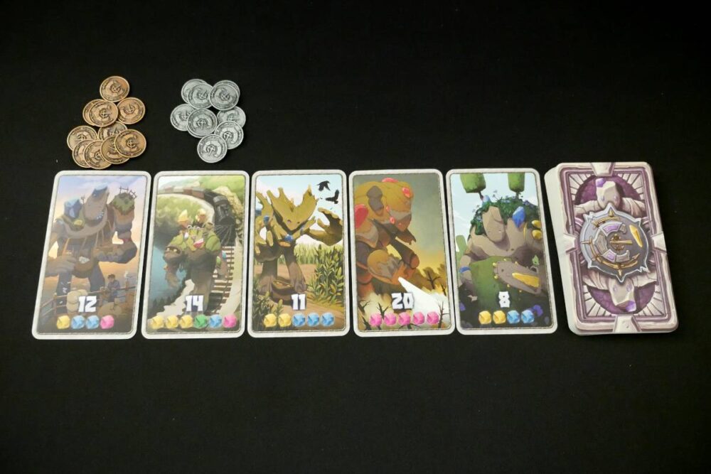 The same goes for the 5-card Golem market. Every Golem card needs a specific set of crystals in order to buy. Once bought, the Golem card doesn't actually do anything—it's worth points and nothing more. The remaining Golem cards to the right shift over and a new one is drawn, filling the now-empty right-most spot of the market.