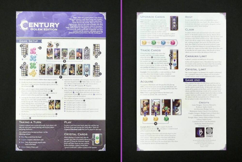 Century: Golem Edition isn't a hard game to learn at all. The core concept is simple. The actions and market are simple. The crystals are simple. I mean, the whole rulebook fits on a single double-sided sheet, so that should drive home how uncomplicated it is.