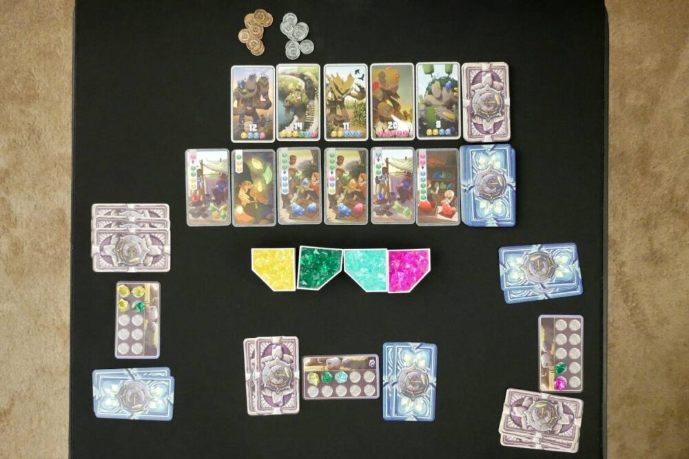 Century: Golem Edition is pretty easy to set up. You just have to shuffle the Golem and Merchant decks, draw the market for each deck, and place the Copper and Silver Coin piles above their respective Golem spots. Give each player their Caravan and starting action cards, then put out the supply of crystals in order of value (from Yellow to Pink).