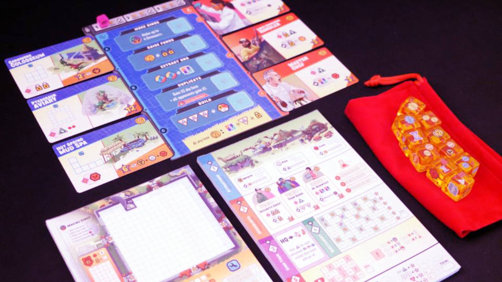Each player is trying to build the most successful dinosaur theme park, represented by your individual park sheets. To do this, you will need to: acquire DNA to create Dinosaurs, hire Specialists for their special abilities, construct Attractions and Buildings to maximize the Excitement of visitors, and make sure you have adequate Security to handle the increasing dangers of your park.