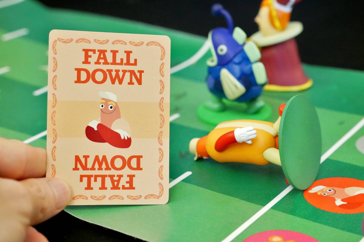 Here's the second big twist: Fall Down cards cause the mascot to literally fall down. While fallen, a mascot only moves a maximum of 1 space per movement card. Mascots also fall down when another racer moves into them or through them, like with a Swerve card. And if a mascot falls down while already fallen? They're disqualified! That means removed from the track and put on the lowest open space on the podium.