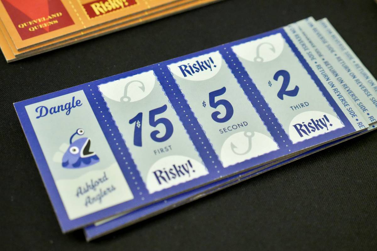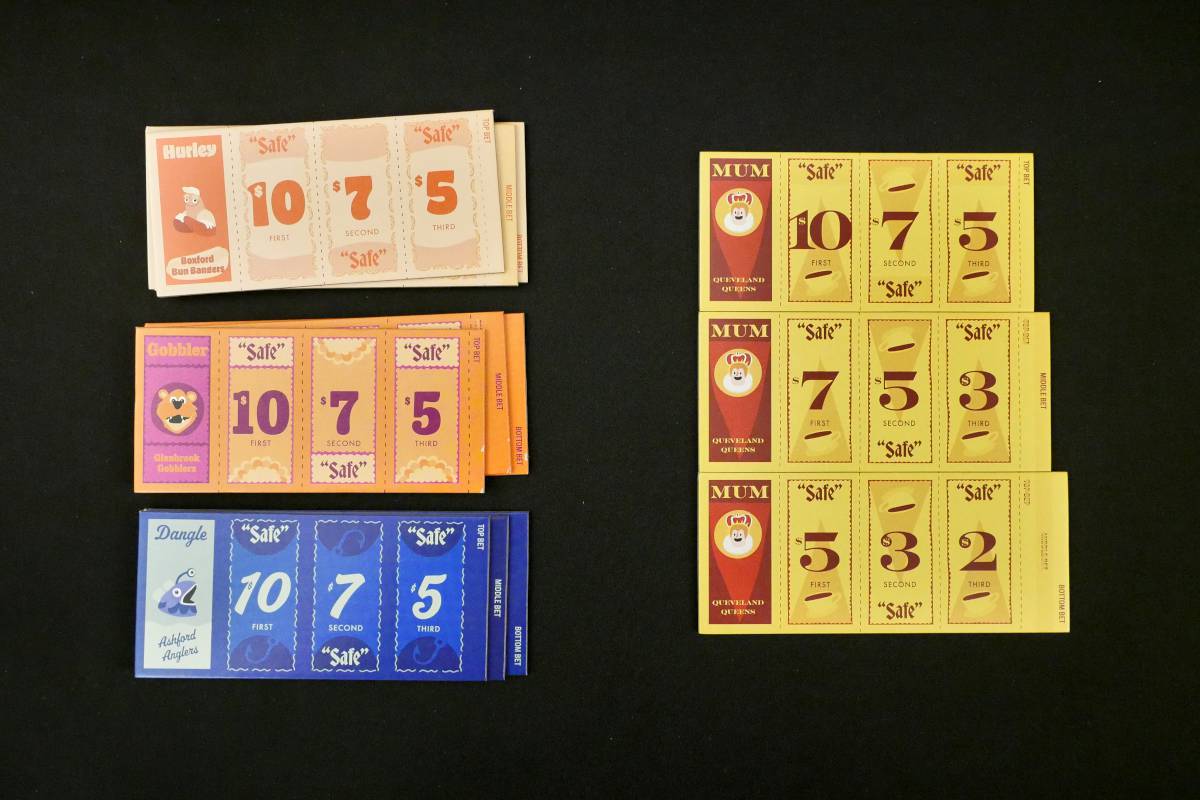 Before the race starts, players bet on mascots by drafting betting tickets. A betting ticket shows the payout for a given mascot if they place in 1st, 2nd, or 3rd. Not all betting tickets are equal, though—there are only three betting tickets per mascot, and they get progressively worse.