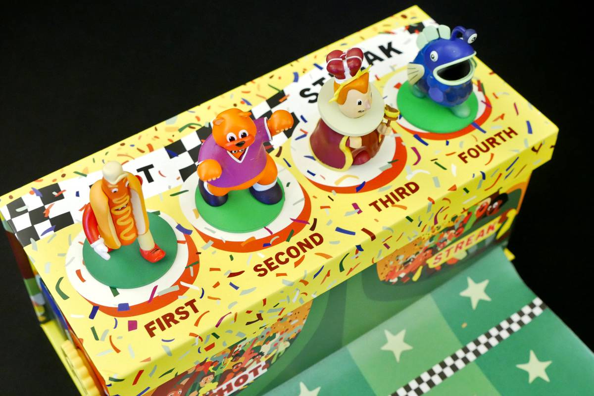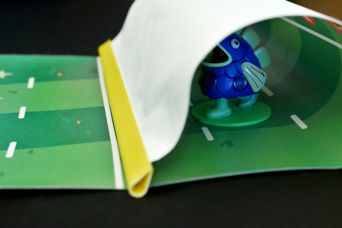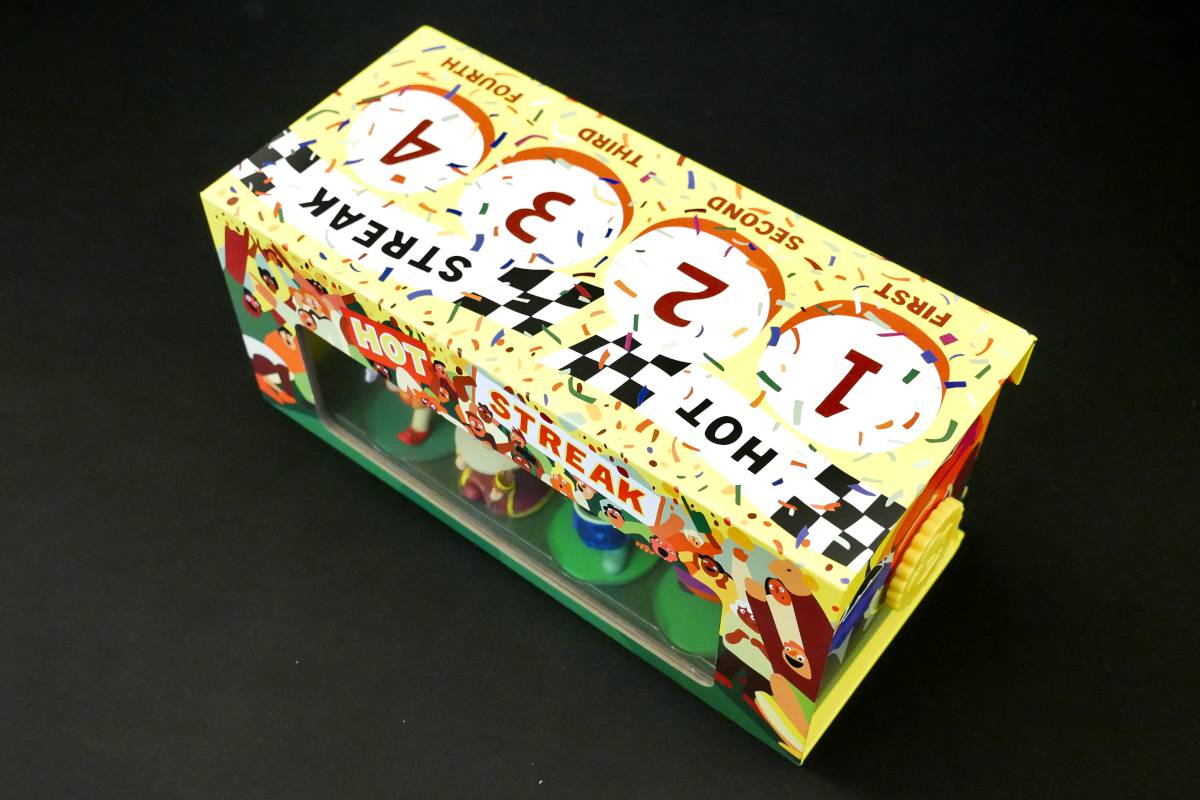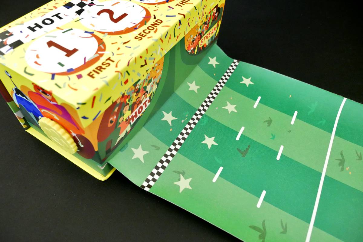 The game starts with the race track, which extends from the game box like a window shade. Each mascot starts on their designated starting spot, with their own lane leading down the track. Winners are determined by the order in which they reach the finish line (of course), but racers can also be disqualified along the way in various ways.