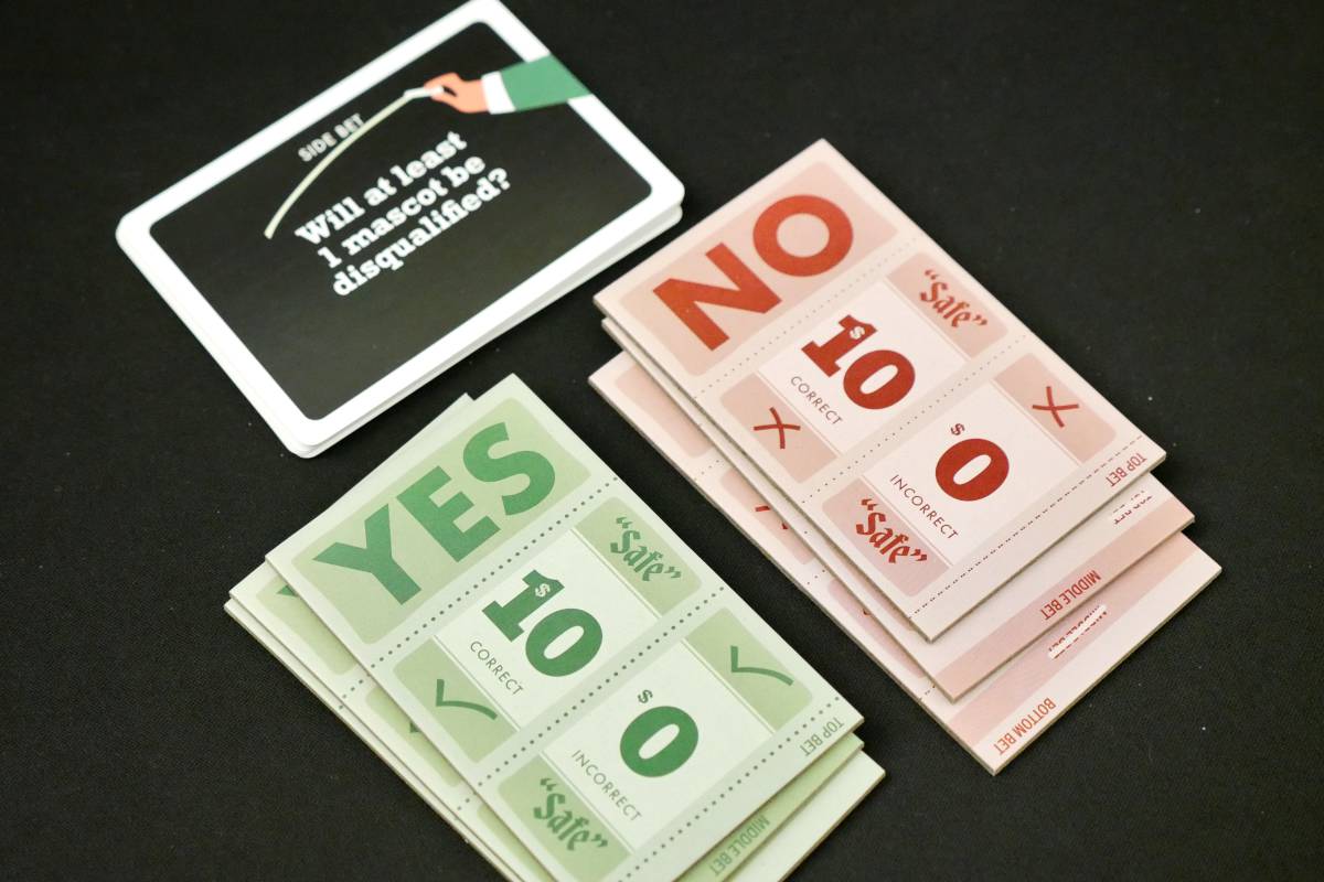 For example, here's one of the Side Bets: "Will at least 1 mascot be disqualified?" It's a simple Yes/No question. If you want to bet on it, you just draft a Side Bet ticket instead of a Mascot Bet ticket.