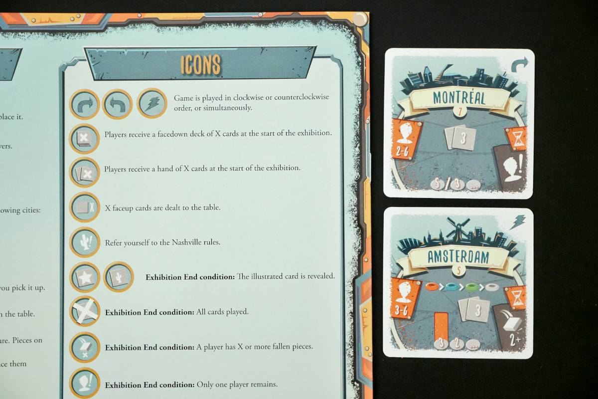 Fortunately, the Cities are all straightforward. The rulebook lays it all out in an organized way, clearly spelling out how each City sets up, how player turn order works, what the win condition is, what happens to fallen pieces, and how the scoring works.