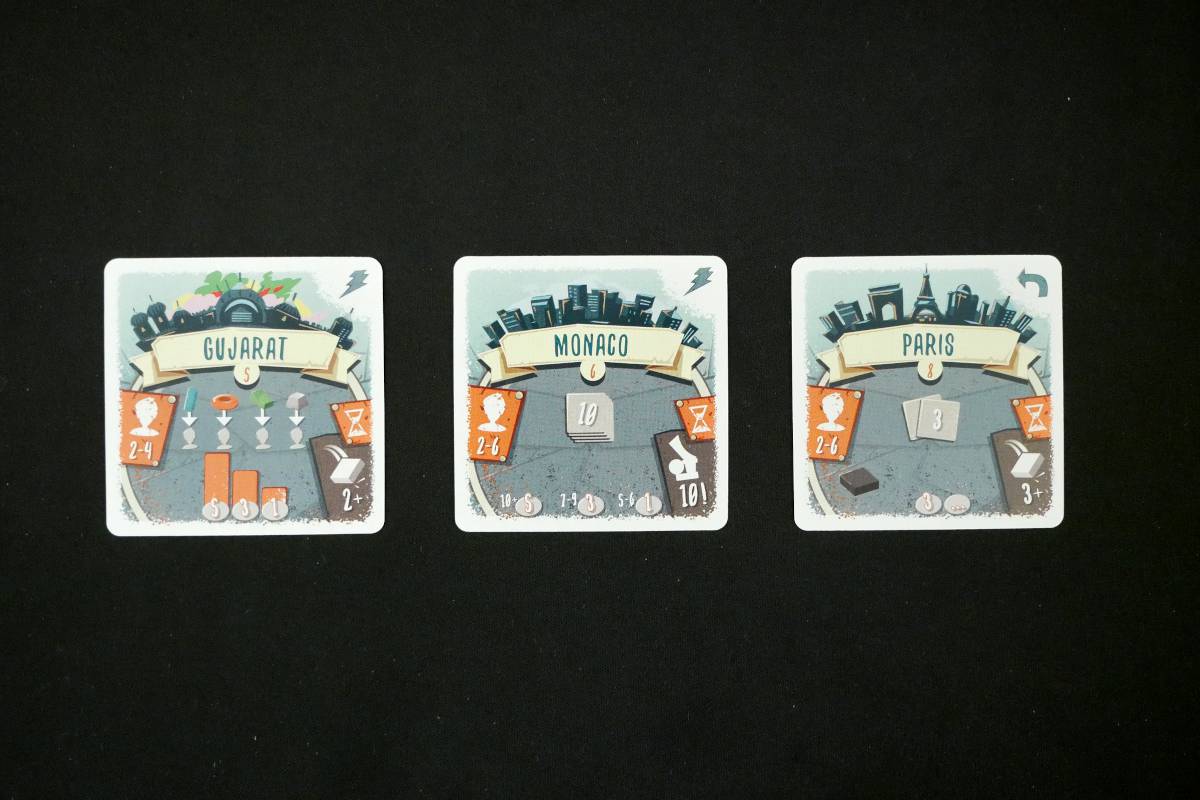 The only thing to note is that each City has its own player count range, so a couple won't be playable if you have too few or too many: Amsterdam is for 3-6 players while Gujarat is for 2-4 players. The rest are for 2-6 players, the full range supported by Junk Art. (Nashville is for 2-4 players, but you also need another game called Flick 'Em Up for that one. I've never played it.)