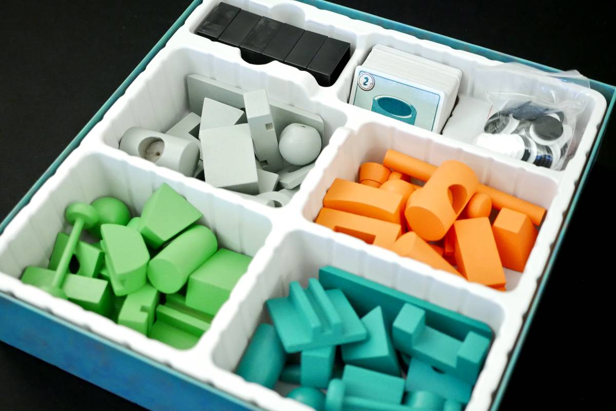 The game box and insert are well-designed. The insert is made from plastic and consists of four large compartments for each set of Junk pieces, plus smaller cubbies for the other components (i.e., cards, bases, etc.). It's not excessive—in fact, it's a very good use of the space and eases setup. Given how much is in this game, I appreciate the smart design.