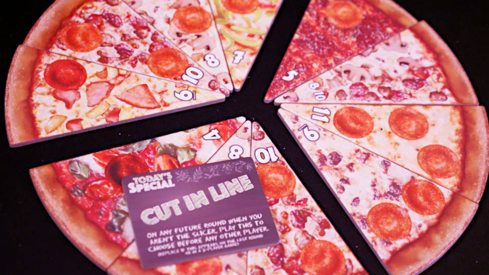 A reimplementation of the 2008 game Piece o' Cake, New York Slice takes the cake theme of its predecessor and slaps a pizza over it. The box looks (and opens!) like a pizza box. The rulebook is formatted like a pizzeria menu. The game itself consists of pizza slices with a variety of toppings across them. Seriously, it looks fantastic.