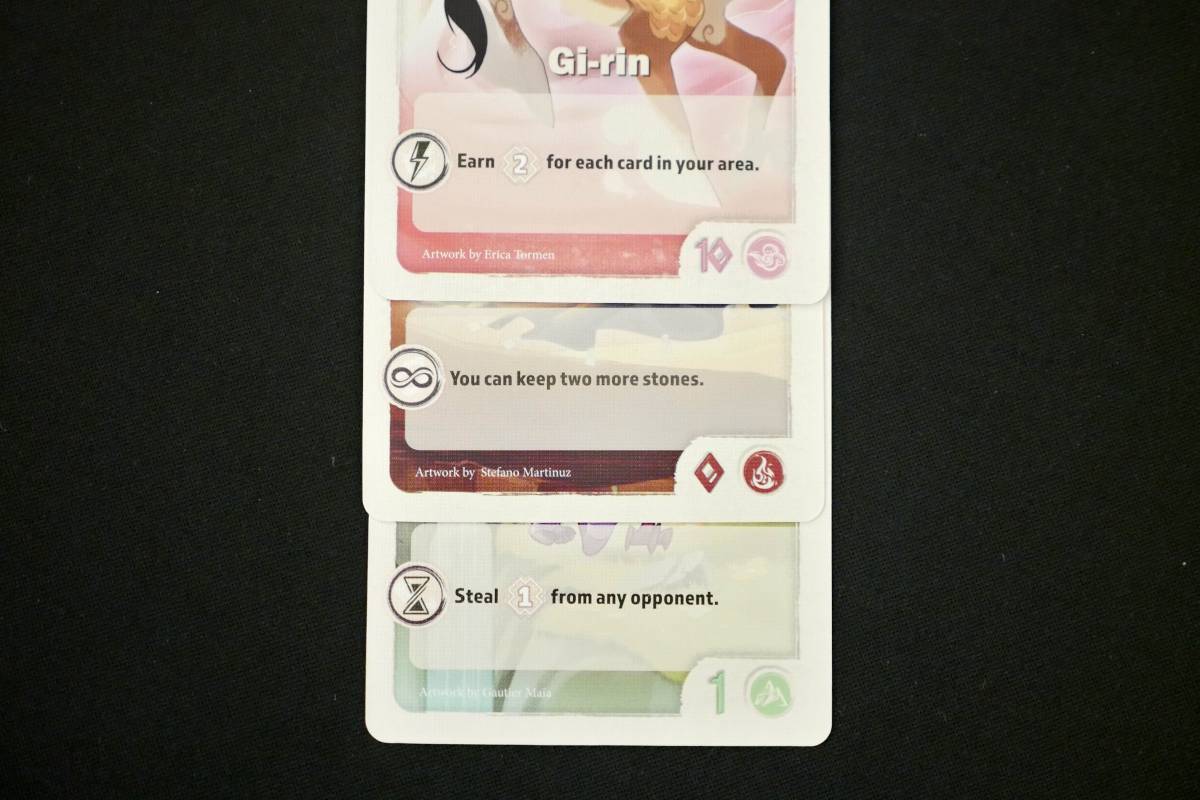 Meanwhile, the different Monsters may sway you to favor certain stones over others. Troll gives you 3 points at the end of the round if you have a 6-Stone in your possession. Kappa gives you 2 points every time you summon a Monster using a 3-Stone. Agni turns your 1-Stones into 2-Stones. These small details pull you in various directions. Which way will you go?