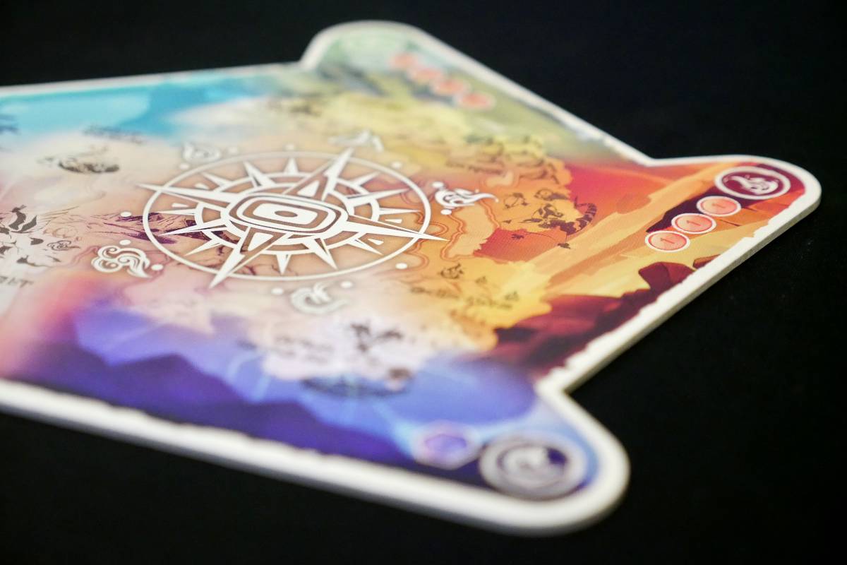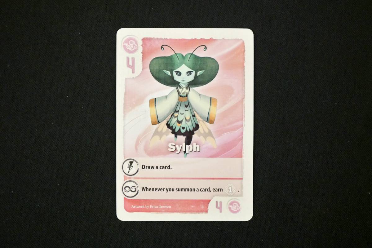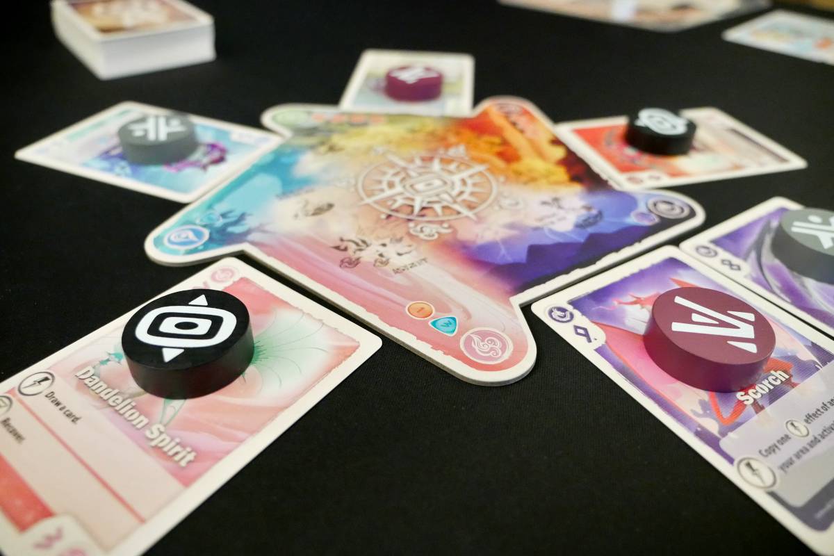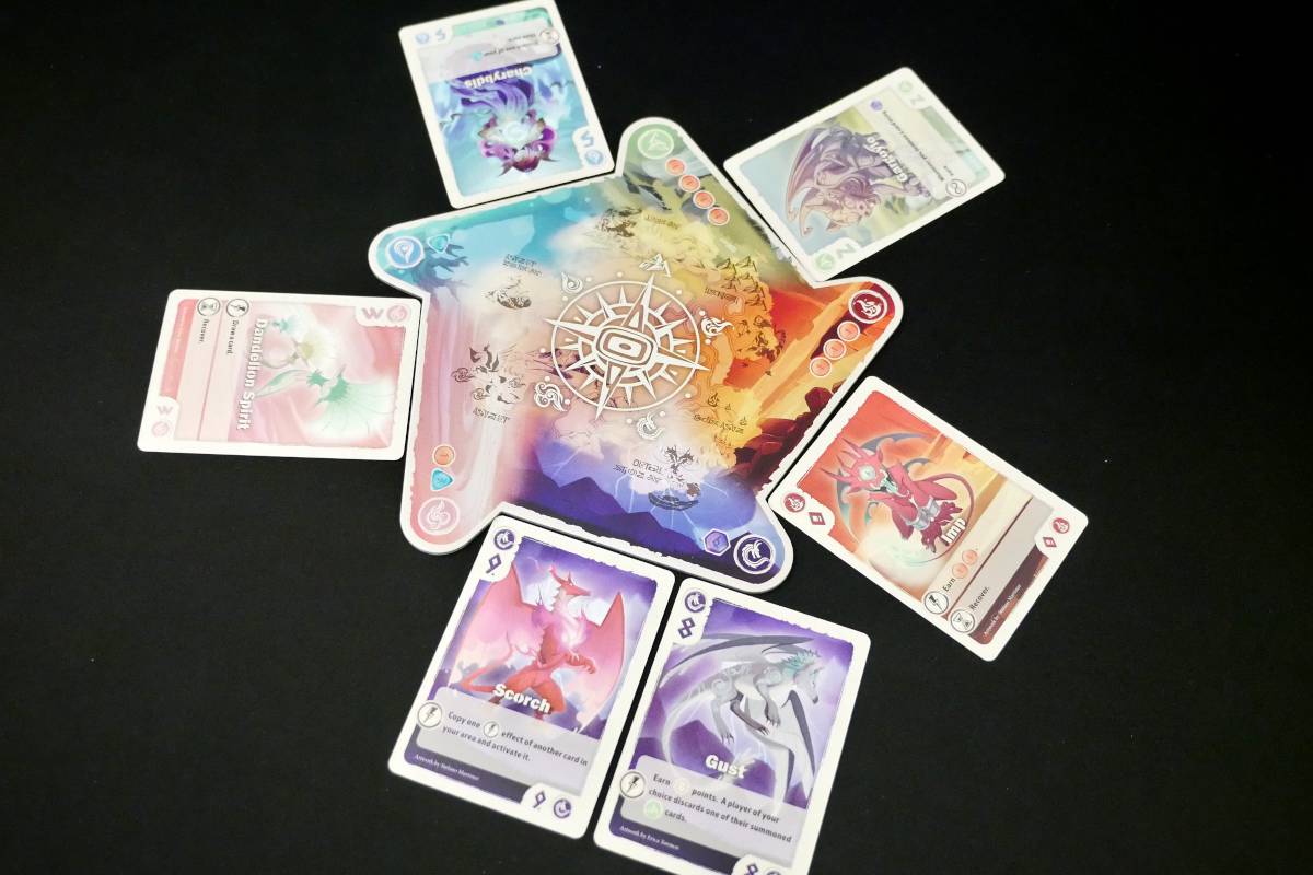 The Game Board is an eye-catcher. That pentagonal shape with each "arm" extending out for each elemental family? Not an approach you often see in card drafting games, so it stands out—all while being functional with the selling price printed right there on the board. My only complaint is that some cards are always going to be upside-down, so there's a lot of picking up cards to read them and setting them back down again. But with the board being circular, at least it affects everyone equally.