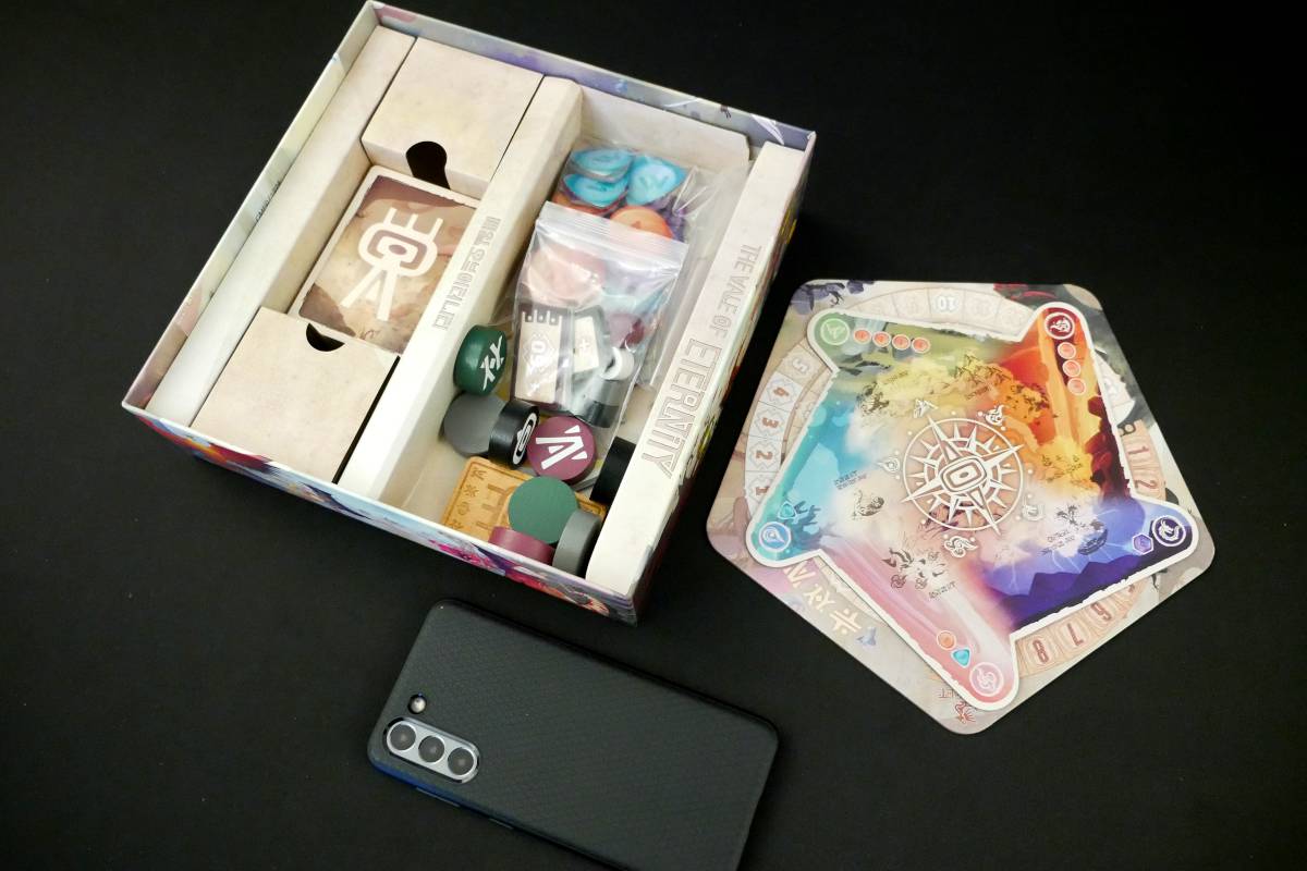 I appreciate the game box size and insert, but it could've been a lot smaller.The Vale of Eternity is ultimately just a 70-card drafting game—everything else exists to facilitate a smoother learning curve and play experience. The box has a lot of dead space and it's way bigger than it needs to be (no doubt to fit the unusually designed Score Board). I honestly think it's to its detriment, betraying the kind of game that awaits inside.
